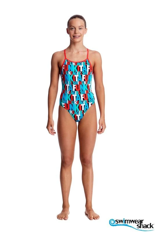 Our classic training style with signature diamond back strap finish and modest rear coverage is perfect for lap sessions. Features a circular cut-out back. With front lining and Funkita embroidery, this easy style says it all. Available in girls’ sizes 8 – 14.