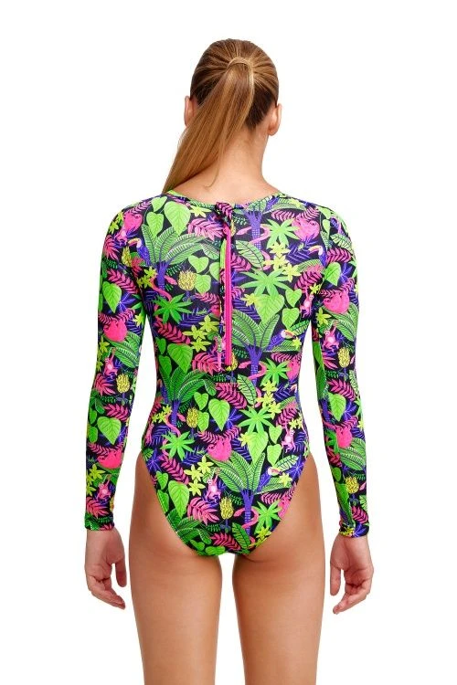 - Full coverage for the girl who wants complete sun protection on their upper body with full arms, high back and high neck one piece.