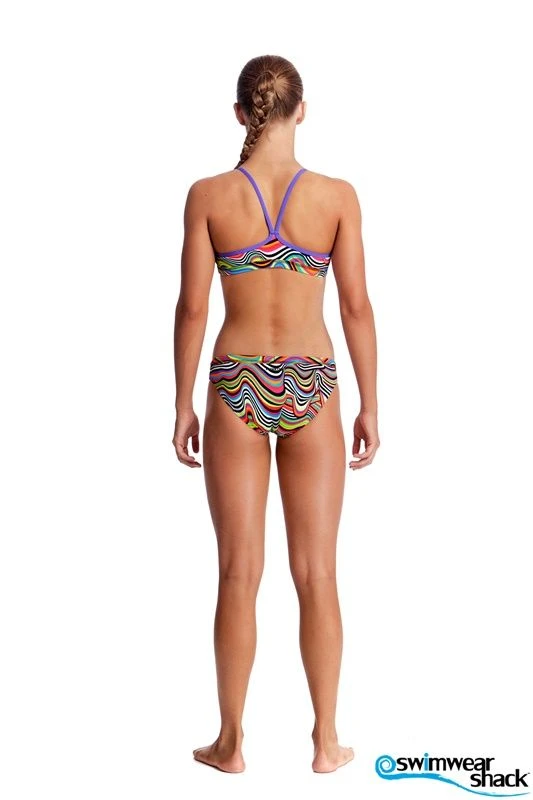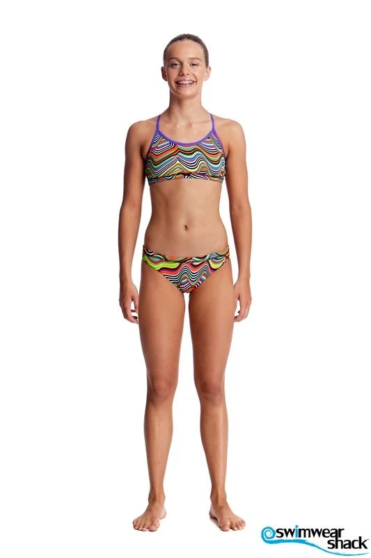A firm fitting crop top and hipster brief suited to the sporty girl. It’s a secure fit with underbust and waist elastic and drawcord in the brief. Features a single shoulder bind strap finish. Available in sizes 8 – 14.