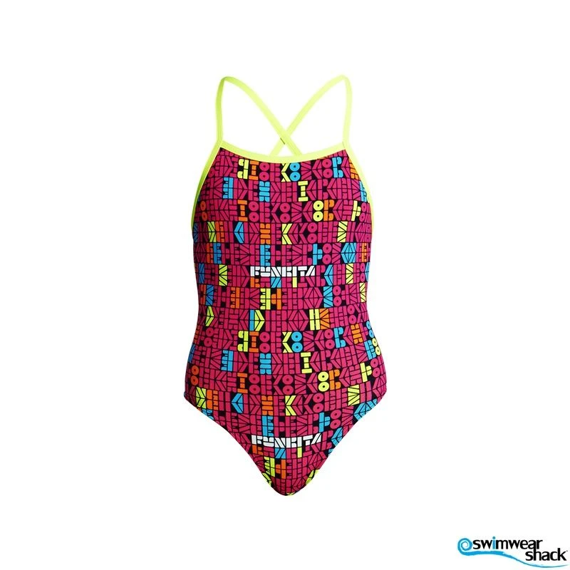 You’ll be sure to get noticed on pool deck in our strappiest one piece yet! Single strap binds that criss cross down your back with a moderately high cut leg. Available in sizes 8-14.