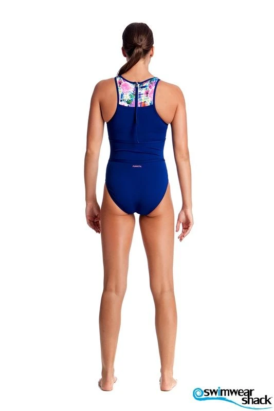 A high back, high neck one piece with a mesh panel across the chest and zip fastening to secure at back. Panelled to create a strong silhouette and lined with powermesh for an extra supportive fit. Moderate rear coverage. Available in sizes 8 – 16.
