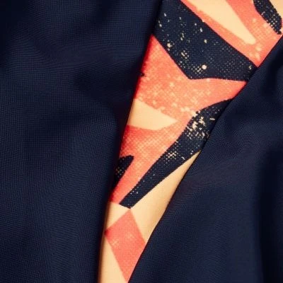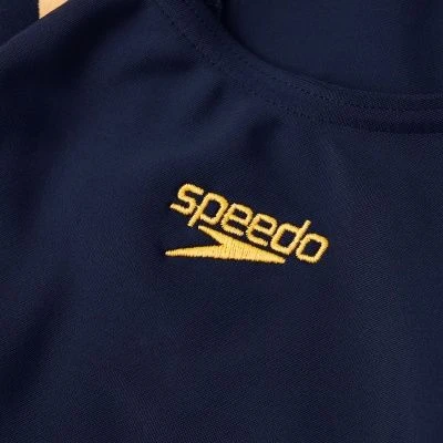 Iconic Speedo Style. This sporty navy Muscleback swimsuit features a curved splice of our new ‘shattered’ Boom logo print in shades of red and orange. Great for longer swim sessions, the muscleback style enables your child to achieve a full range of motion during their swim. Made from our soft Endurance10 fabric, it provides higher chlorine resistance than standard swimwear fabrics and fits like new for longer with CREORA® HighClo™.