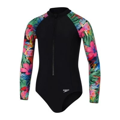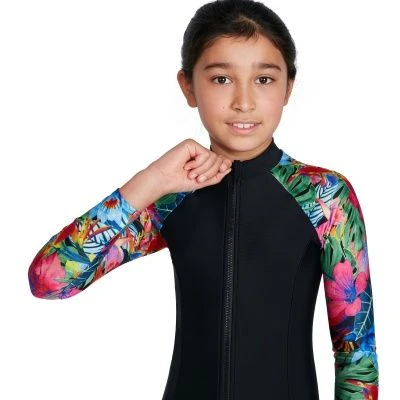 Stylish swimwear for swim, surf and SUP. Walk on the wild side wearing the stunning Long Sleeve Swimsuit, featuring a sleek black design with on-trend animal print sleeves. Made for junior beach adventures, the all-in-one suit includes a front zip opening and is front lined for your child’s comfort and modesty. Offering full coverage across the chest, back and arms, it’s great for fun days on and off the board. The ECOEndurance 10 fabric offers superb colour performance, so you can enjoy the vibrant animal print for longer. Offering higher chlorine resistance than standard swimwear fabrics, it fits like new for longer with CREORA® HighCloâ„¢ and is made from 100% recycled yarns.