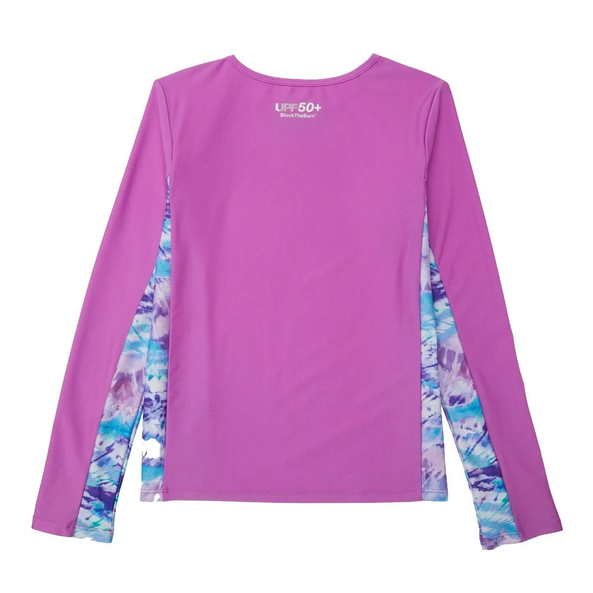 Prepare young swimmers for fun in the water with a durable rashguard. This fitted top features printed long sleeves and side panels. UPF rated, so she can splash all day.