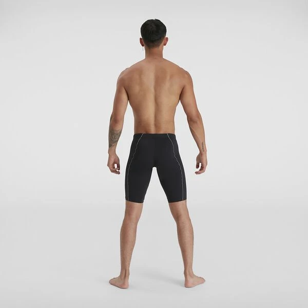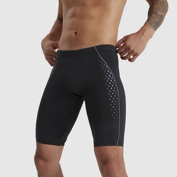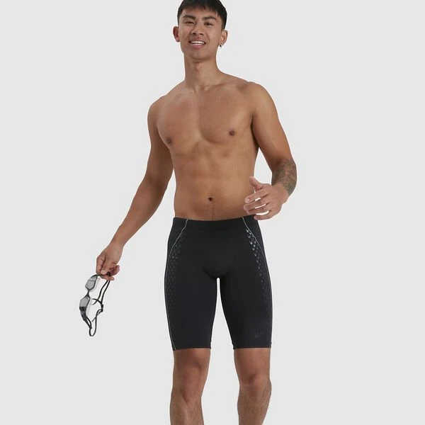 Performance swimwear. This tech inspired, sleek ECO Endurance+ Pro Jammer is packed with technical innovations that help take your training to the next level. Striking in black with a graduated iridescent sharkskin print, the jammer includes a silicone gripper waistband and a flat drawstring which sits within a dedicated waistband channel for a customised fit. The V-cut design with rubberised liner ensures you feel supported and comfortable, while anti-microbial technology keeps the jammer fresh swim after swim. Designed to be durable and better for the environment, it’s made from our new ECO Endurance+ fabric which is 100% chlorine resistant, quick-drying and made from 50% recycled materials and has the added benefit of being finished with a water repellent and anti-microbial treatment.